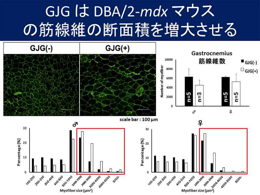 一方で、牛車腎気丸(GJG)が老化促進モデルマウスの筋量を増加させる事を萩原らは報告している(3)。マイオスタチン同様に筋量を増加させる作用は筋ジストロフィーの対症療法になる可能性を考え、我々が独自に開発した筋重量低下が著しいDBA/2-mdxマウス(4,5)を用いたGJGの効果を検証した。その結果、萩原らの報告同様に、GJGはDBA/2-mdxマウスの筋量を増加させる事ができた(6)。つまり、GJGの効果は老化モデルに限らず筋量低下を呈する状態において普遍的に効果を示す事が考えられる。しかし、残念ながら筋ジストロフィー症状を改善する作用は期待できなかった。GJG単剤では筋ジストロフィー対症療法薬にはならないが、病態を改善できる方法が確立されれば、それら薬剤との併用は効果的な作用を示す可能性は残されている。